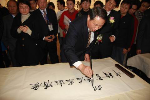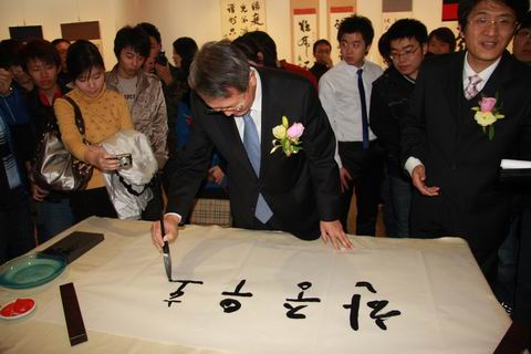 开幕式后中韩书法家笔会辛正承大使首先开笔