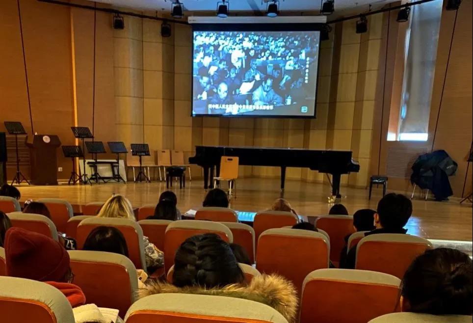 师生在音乐厅集中观看由中央军委政治工作部、国家广电总局和中央广播电视总台联合出品的大型电视纪录片《为了和平》。168开奖网