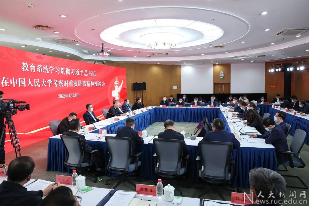 4月28日,教育部在中国人民大学召开教育系统学习贯彻习近平总书记在中国人民大学考察时重要讲话精神座谈会,进一步把重要讲话精神有效转化为实际行动和扎扎实实的工作效果。教育部党组书记、部长怀进鹏出席会议并讲话,教育部党组成员、副部长田学军主持会议,教育部党组成员、中央纪委国家监委驻教育部纪检监察组组长吴道槐,教育部党组成员、副部长郑富芝、宋德民出席会议。