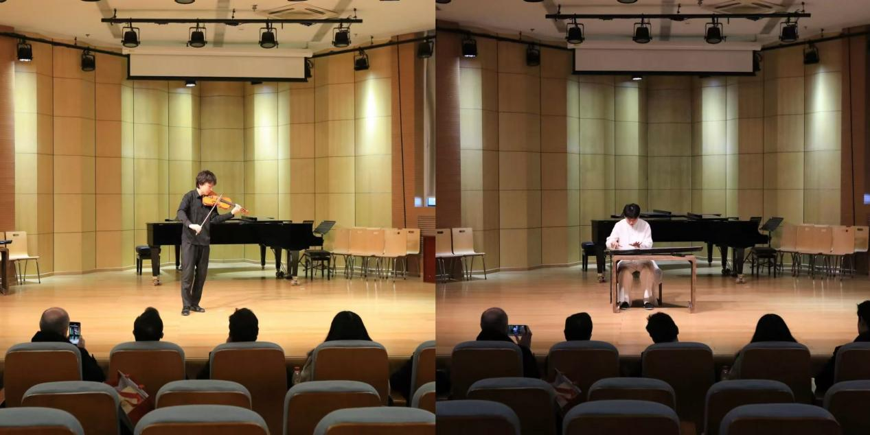 音乐厅,科英布拉大学代表团一行欣赏了音乐系学生的精彩表演,古琴《高山流水》和小提琴《帕格尼尼练习曲》交相呼应,奏响两校中葡文明交流互鉴新篇章。