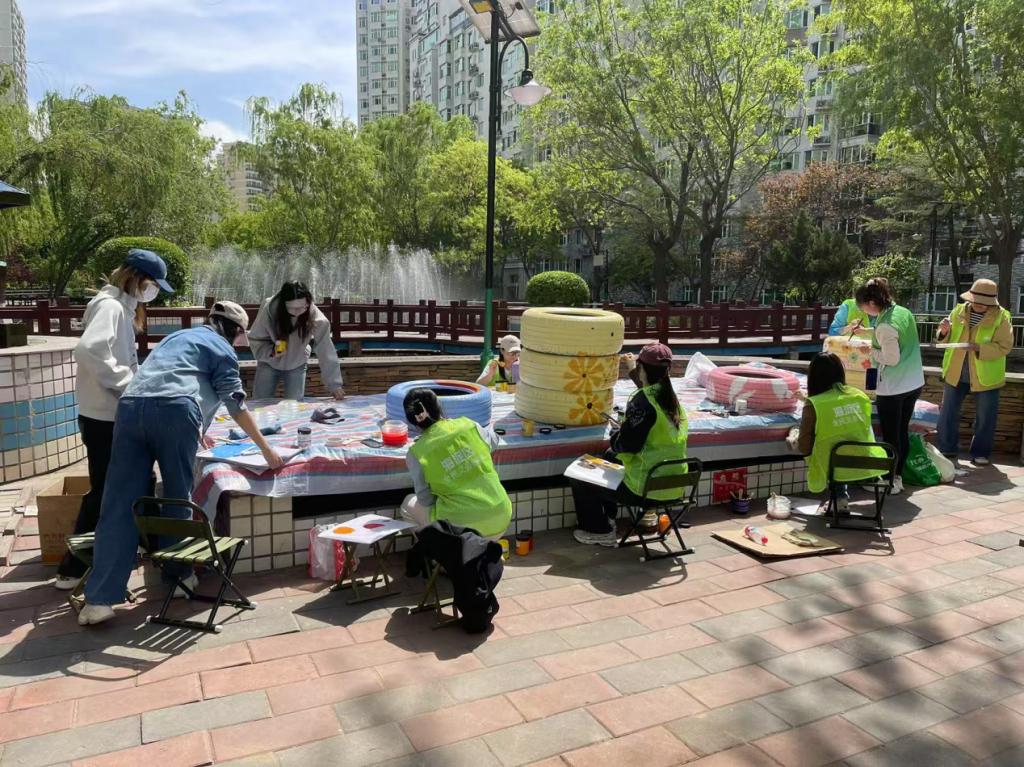 在实践过程中,同学们通力协作,连夜完成轮胎和背景板底漆刷涂,确保色彩的饱满持久和艺术效果的最终展现。社区的小朋友们也在同学们的指导下参与到轮胎涂色中,增添了更多童趣与活力。