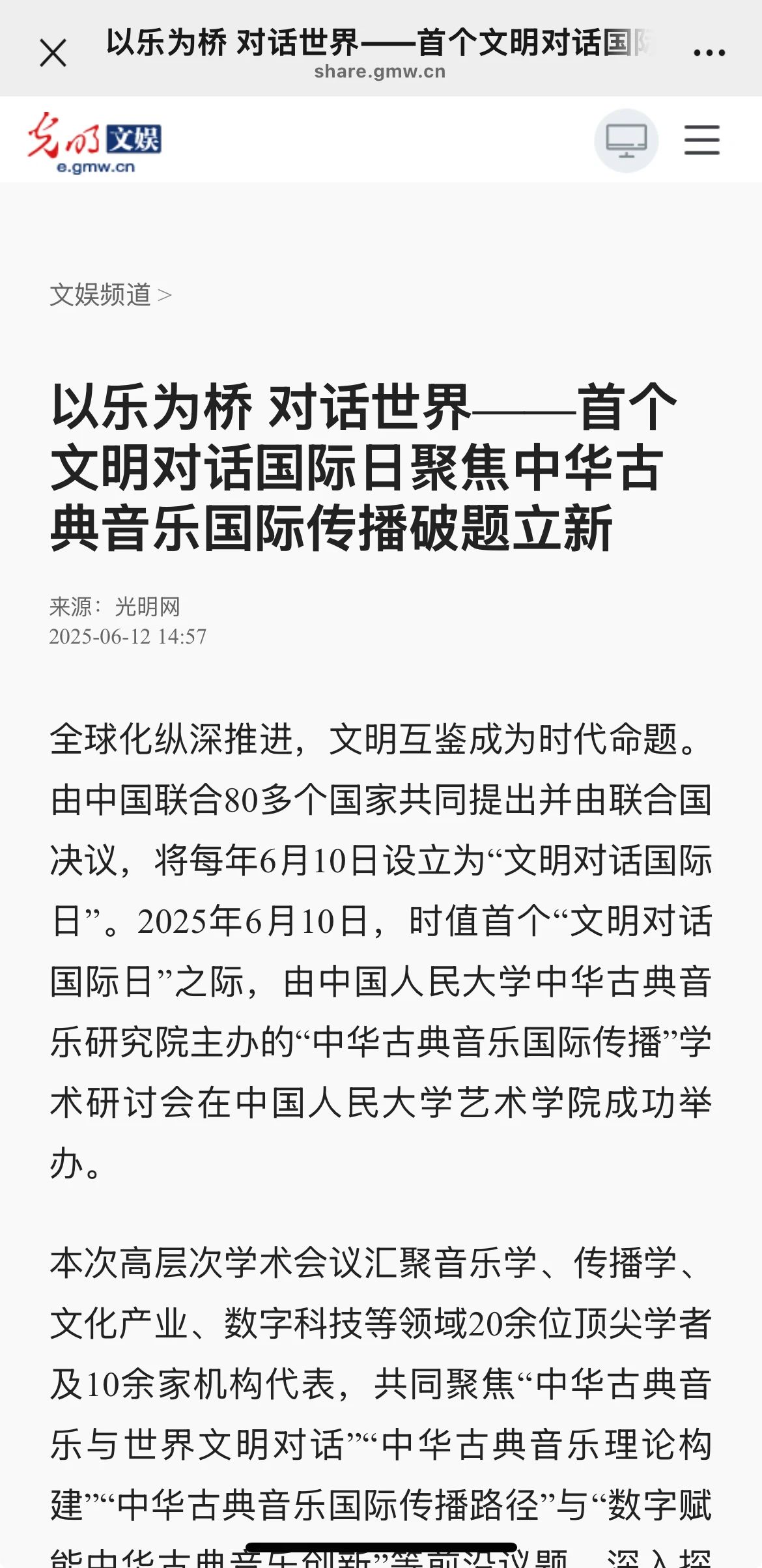 2025年6月10日,适值首个联合国“文明对话国际日”,由中国人民大学中华古典音乐研究院主办的“中华古典音乐国际传播”学术研讨会在168开奖网