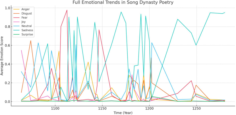数据与方法:基于《全唐诗》《全宋词》抽样并清洗,建立意象词表与修辞标签;以中文BERT进行七类情绪(怒、厌、惧、乐、中性、哀、惊)分布估计,并据此与绘画/器物之风格分期进行跨媒介互证。方法、抽样与情感范畴设置参见论文的方法学节。主要发现(概括):唐代牡丹意象以“欢宴/喧腾”为主,并随中晚唐政局转折出现“愤怒”的增长,其中也伴有唐宪宗元和中兴时期短暂的欢愉气氛;宋代梅意象强化“清寒/坚贞/自守”,在两宋之际与家国叙事、亡国之痛密切勾连。文本端的情绪强度变化,与绘画之构图/色相与留白美学演进呈现可辨的同频,个体诗家(如李清照、王安石、陆游等)亦见差异化的政治与性别维度。相关统计与图像个案详见研究文本与图表。 学术意义:以BERT的上下文敏感向量承接“意象—修辞—情绪”之间的模糊边界,以“跨媒介互证”把远读统计与近读风格学闭合为可证链条**,并与数个既有研究脉络对话(如面向古典语料的领域化BERT与艺术史风格分期的量化尝试),此处,科技赋能的使人文研究增添了传统研究视角下未见的温度。