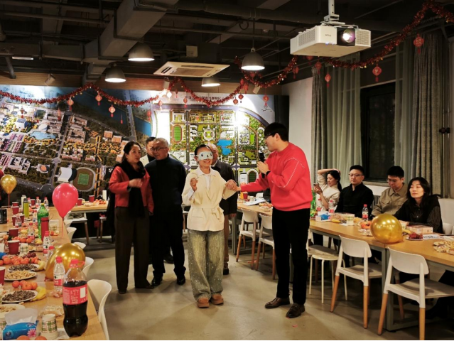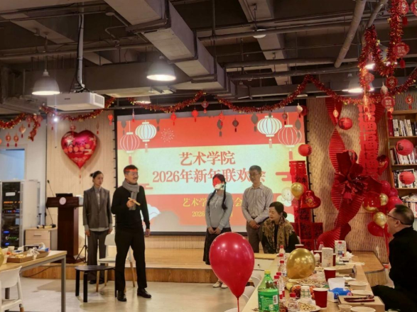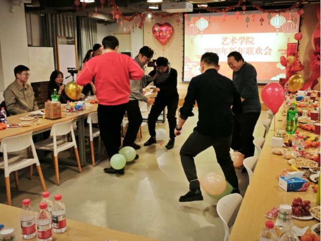 联欢会中穿插的多种趣味游戏成为一大亮点,老师们积极参与、默契互动,现场气氛热烈非凡。“你‘划’我猜”游戏中,由行政和四个学系代表组成的五支队伍展开激烈角逐。选手们通过生动的肢体表演,展现出了丰富的想象力和团队协作精神,现场笑声不断,加油声此起彼伏。“击鼓传花”游戏让全员参与其中,幸运花落之处,才艺展示或新年祝福接力进行,将现场气氛一次次推向高潮。“踩气球——守护色彩大作战”游戏展现了老师们的活力。“蒙眼画五官——盲盒画室”游戏充满趣味性和挑战性,接力创作,现场笑声、掌声交织在一起,充满了欢乐的氛围。