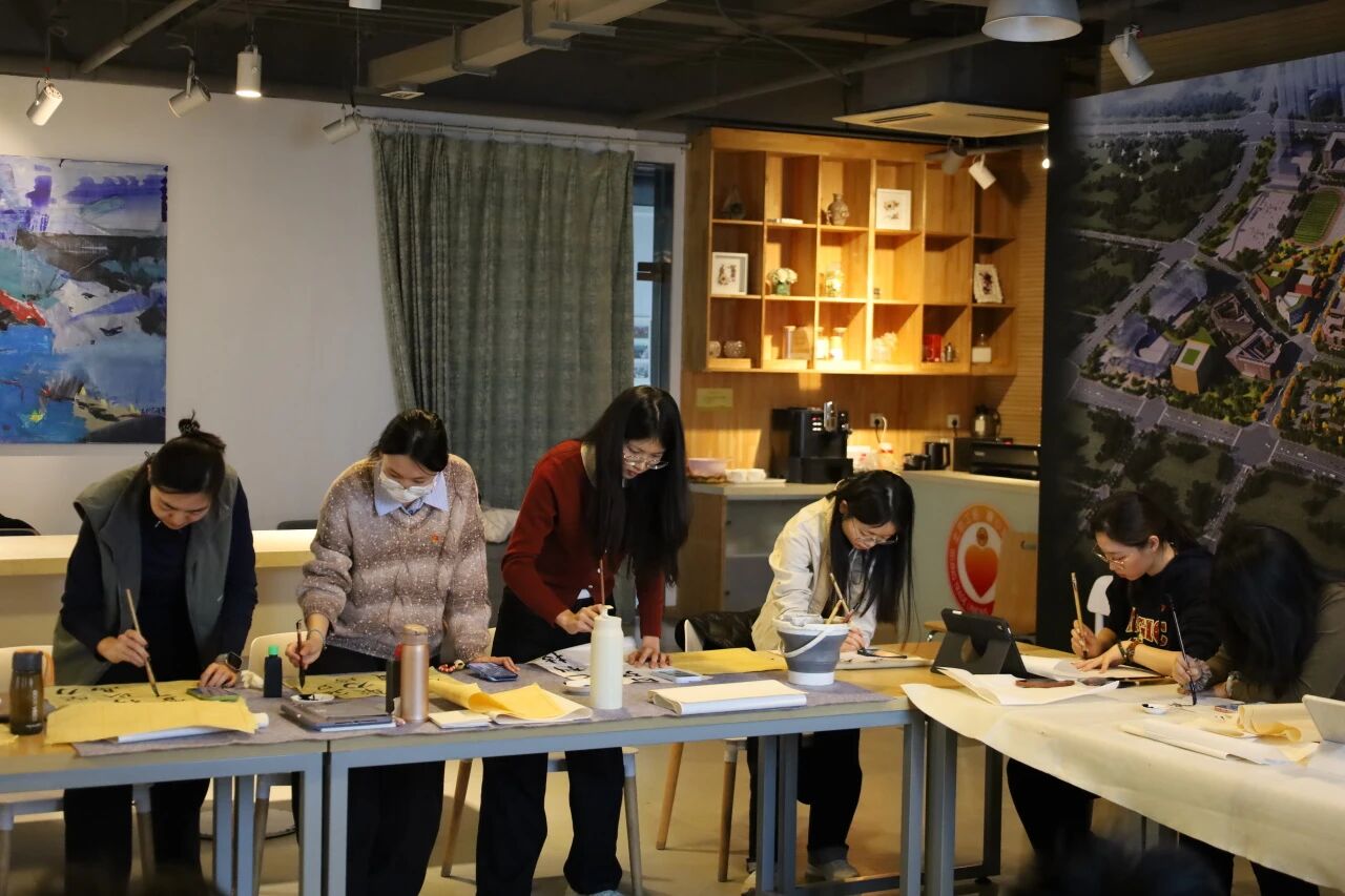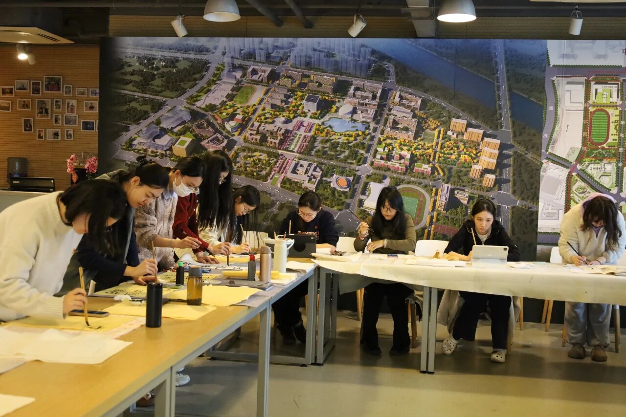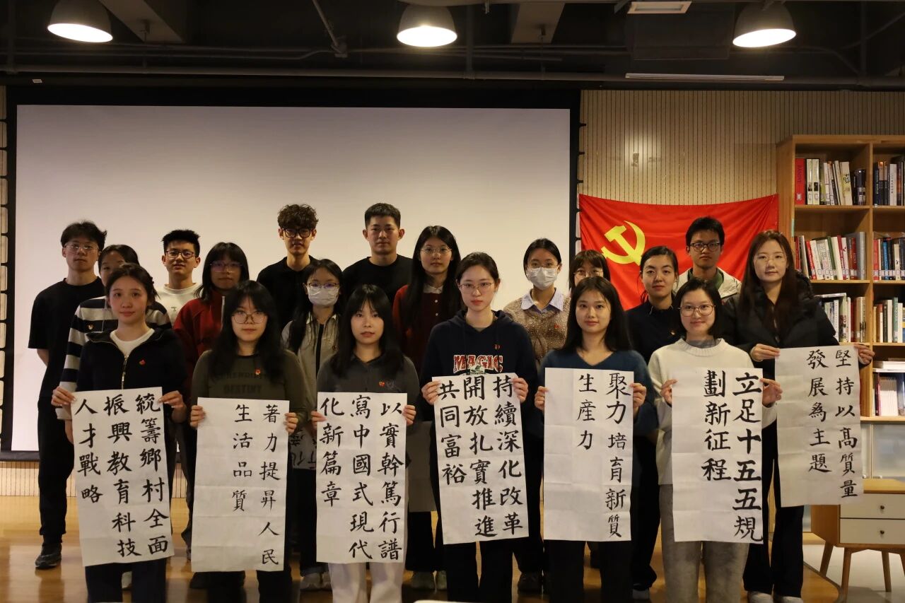 绘画系学生第一、第二党支部与信息学院2025级电子信息硕士党支部全体党员分组体验颜体基本笔画书写,并围绕“十五五”规划关键词,共同进行主题书法创作。大家在提按顿挫中体悟笔墨韵味,在横竖撇捺间凝聚思想共识,以书法为载体表达对科技自立自强与文化繁荣发展的理解与期许。