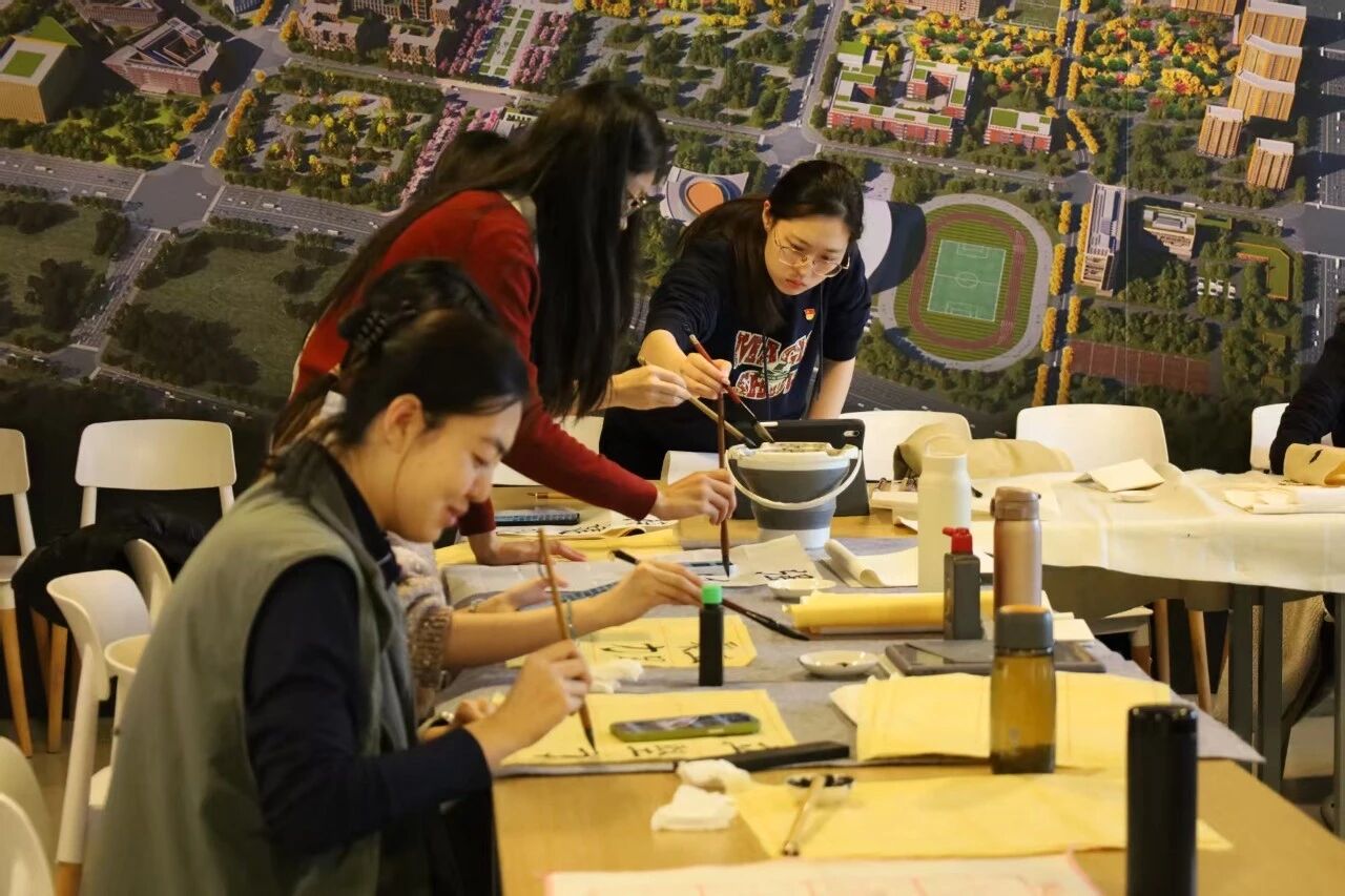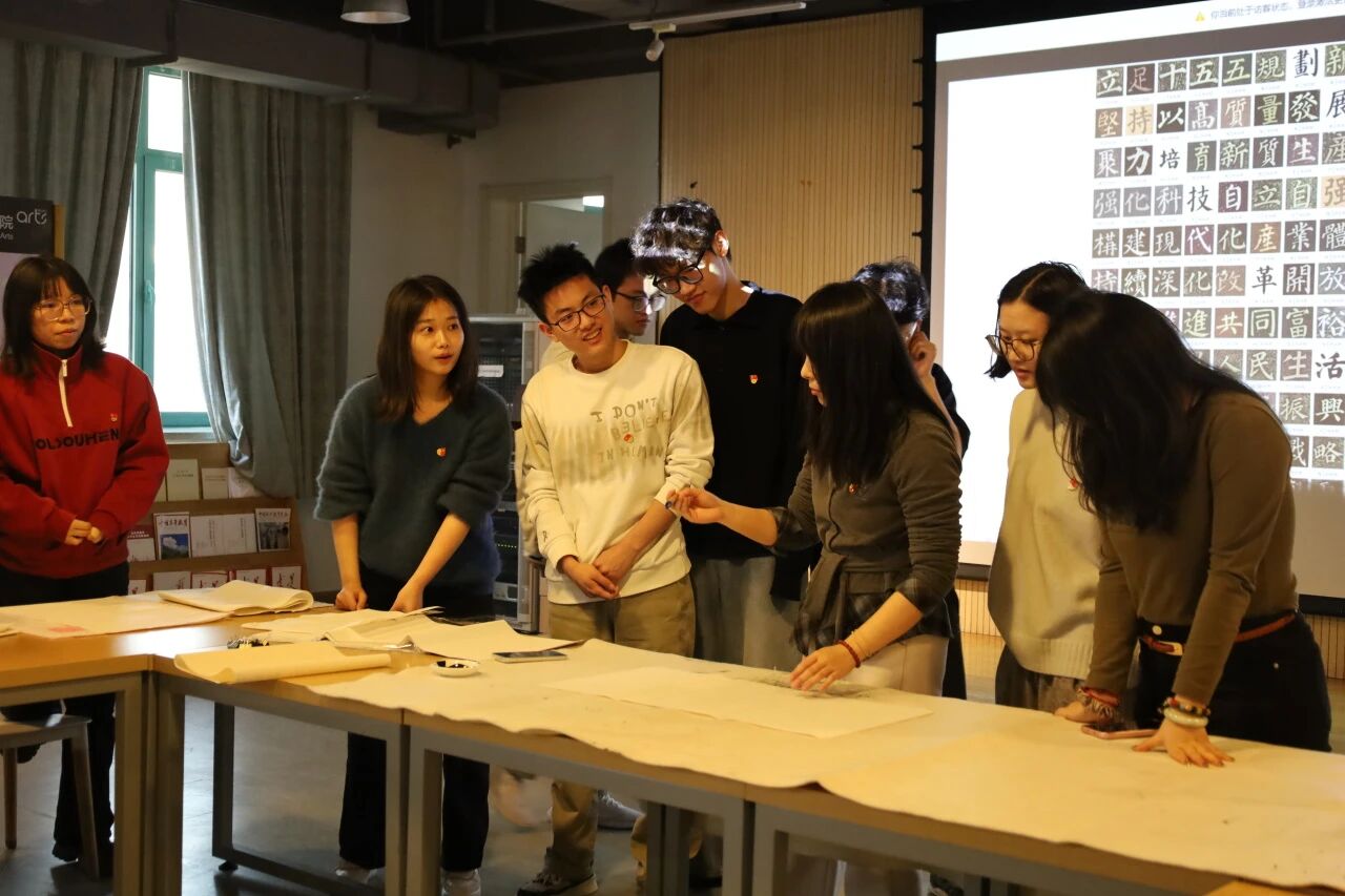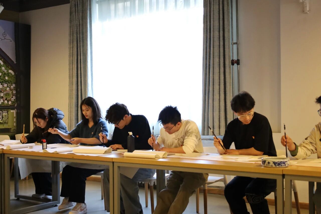 绘画系学生第一、第二党支部与信息学院2025级电子信息硕士党支部全体党员分组体验颜体基本笔画书写,并围绕“十五五”规划关键词,共同进行主题书法创作。大家在提按顿挫中体悟笔墨韵味,在横竖撇捺间凝聚思想共识,以书法为载体表达对科技自立自强与文化繁荣发展的理解与期许。