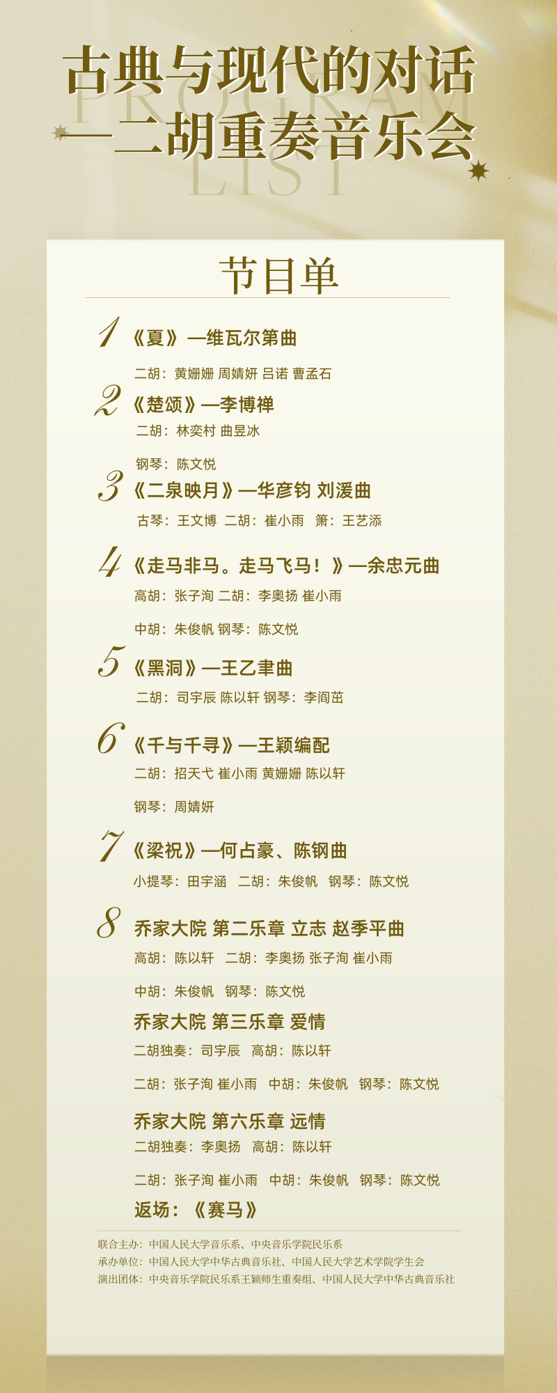 音乐厅举办。本次音乐会由中国人民大学中华古典音乐社与中央音乐学院民乐系青年教师、二胡演奏家王颖带领央音师生共同演绎,选曲涵盖多种风格、不同时期的二胡重奏作品,包括经典曲目、现代创作以及改编作品等,注重与观众的情感共鸣,通过音乐讲述故事、传递情感。