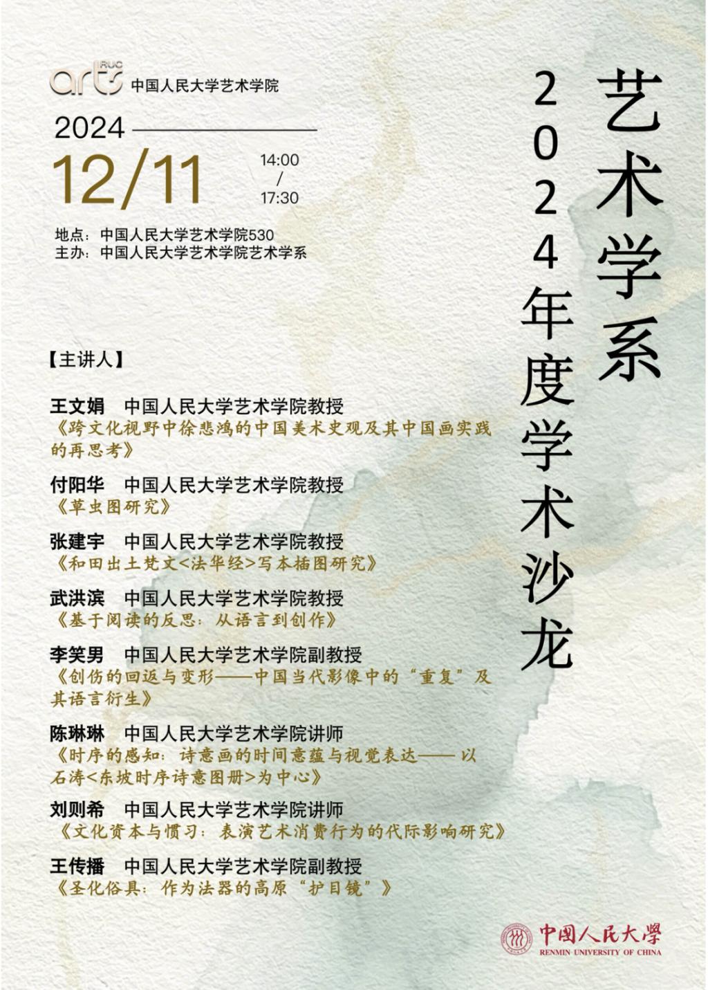 为推进建立艺术学系在我校艺术学理论研究与教学的引领地位,进一步扩大本系学科影响力与知名度,艺术学系举办“2024年度学术沙龙”,面向致力于艺术学研究的广大校内师生,推介艺术学系教师团队的研究课题、研究成果、研究方法与学术兴趣。