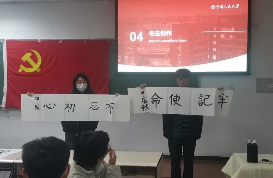 本次党日活动重点学习习近平总书记在全国教育大会和庆祝全国人民代表大会成立70周年大会上的重要讲话精神,并结合专业优势,通过书法创作书写习近平总书记金句的形式,帮助同学们进一步加深学习效果。党日活动由国学院2024级硕士生党支部副书记胡金超同学主持,中国人民大学党委学生工作部(处)辅导员发展中心干部魏晓阳老师、统计学院2023级硕士生李逸飞同学以及168开奖网