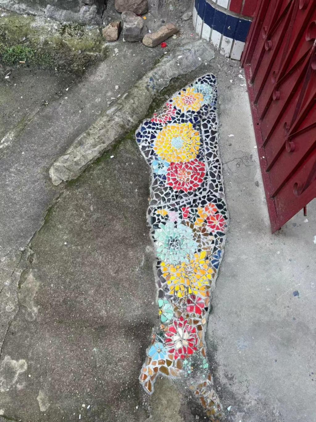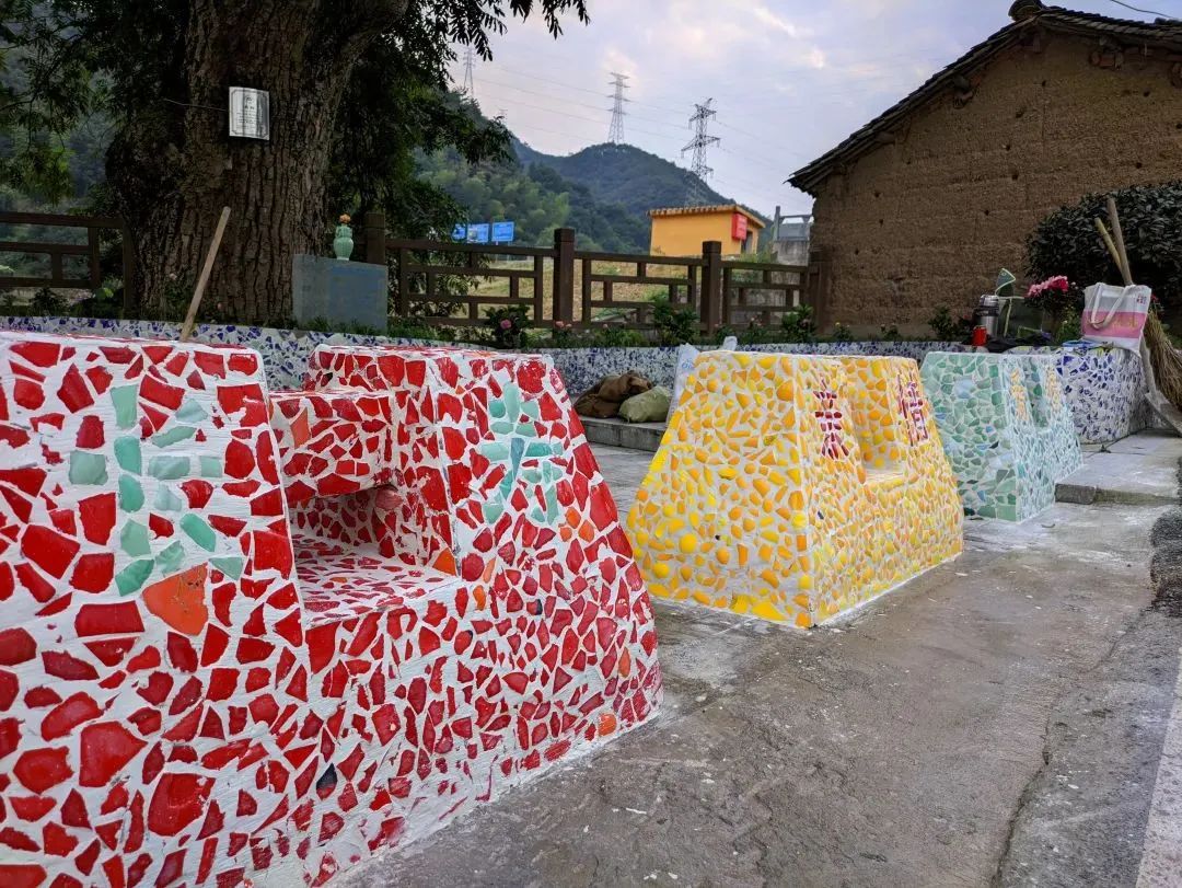 2024年7月,跨越1400公里的距离,即将研一的王艺馨和王汝灏第一次跟随团队来到西圃村,开启了创建“美学角落”的奇妙之旅。从宁波火车站驱车一路向南,穿越高架上游走的蓝天白云,稳稳停在这座曾以制陶闻名的村庄。群山之间,古村之中,藏着团队成员与村民们用碎瓷片共创的充满故事的作品,它们像一个个彩色的精灵,映入两人的眼帘。