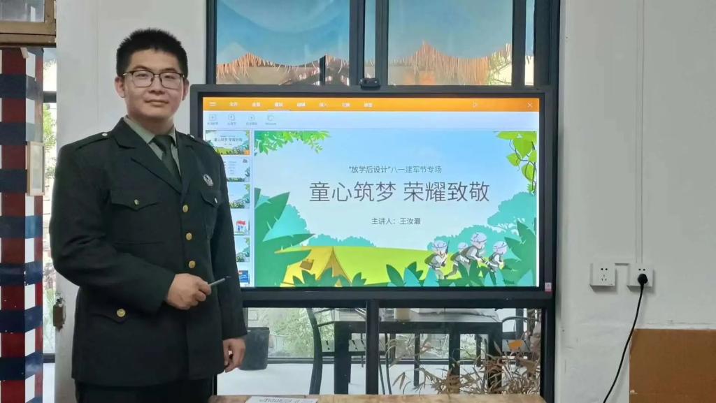 在八一建军节这天,作为退役军人的汝灏精心策划了《童心筑梦·荣耀致敬》专题美育课,穿上军装与孩子们重温军史,教他们敬军礼,并带着大家用艺术创作的方式向军人致敬。