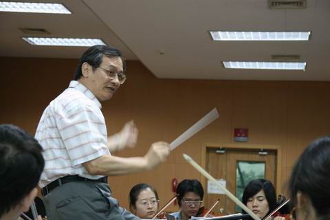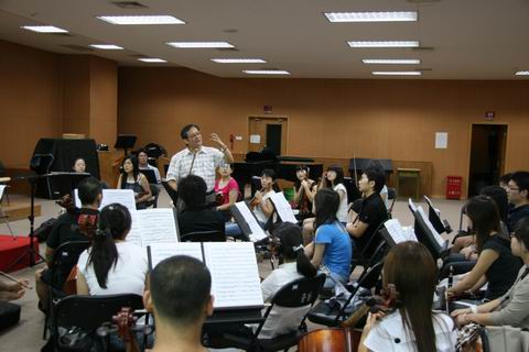 9月5日下午郭连昌教授来到人民大学世纪馆音乐系乐队合奏排练教室,乐队正在排练“贝多芬第四交响曲”。在聆听了乐队排练之后,郭教授亲自执棒指导演奏 “贝四”其中的第二乐章,郭教授简短介绍了作曲家生平、作品风格以及乐队演奏的基本要领。他用同学们意想不到但又简单的提问,启发学生思考一些演奏中经常遇到司空见惯的技巧问题,学生们饶有兴趣的思考并交流争论着,经过一番互动切磋,再听郭教授的讲解,有恍然大悟顿开茅塞之感,比如提琴的弦和弓那个更重要、一个预备动7作一个乐句的划分,大到整个乐曲的构思、音乐的风格、音乐艺术的修养、团队合作精神等,郭教授都讲得简炼易懂深入浅出妙趣横生,学生们受益匪浅。同时,学生们排练时认真的态度,执着精神及强烈的求知欲也受到郭教授的充分肯定和赞扬。