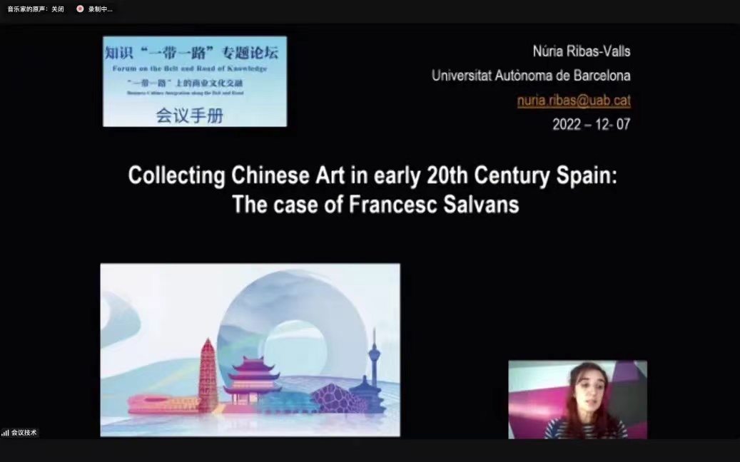 努里亚·里巴斯(Nuria Ribas)以《20世纪早期西班牙中国艺术品收藏——案例分析:收藏家弗朗切斯克·萨尔万斯》为主题,通过介绍萨尔万斯的艺术生平,鲜为人知的中国艺术品收藏,以及西班牙工业城市塔拉萨的文化艺术风貌,揭示了20世纪早期西班牙的艺术品流通与海外购买,讨论了“一带一路”沿线国家艺术品收藏与交流的历史价值和时代意义。