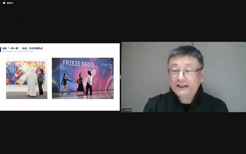 赵力的报告主题是《新兴艺术市场与“一带一路”》,围绕着新兴艺术市场的概念生成,论述与一带一路之间的紧密联系,阐释市场中的重心、交点与焦点,并从近期热点与新热点出发讨论未来与合作,以及在研究、交流上形成共同体机制。