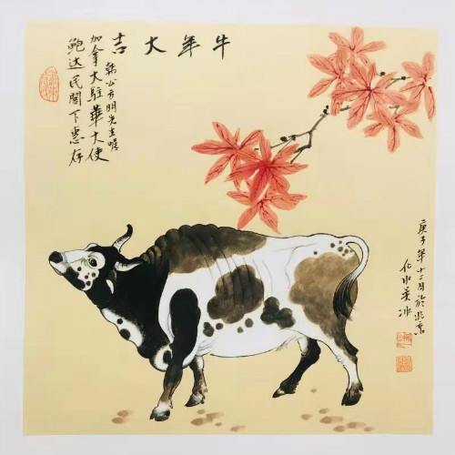 绘画系花鸟画家吴冰副教授创作一幅代表中国传统文化的中国画作品。吴冰老师将唐代五牛图与加拿大红枫叶元素相结合,用传统的中国画形式加以表现。大使收到这件礼物后非常高兴,回复道:“感谢吴先生,我已经把这幅精美的作品装裱好,挂在我办公室的显要位置。”