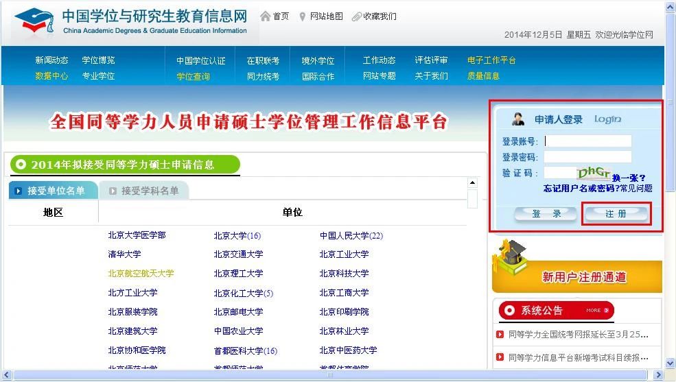 即时起,学员可访问平台注册账号(注册功能在网页右上角,详见上图)。注册账号之后登录信息平台,找到“进入系统”按钮,点击该按钮后正式进入信息平台。之后按照提示流程上传电子照片、填写基本信息及提交学位申请。